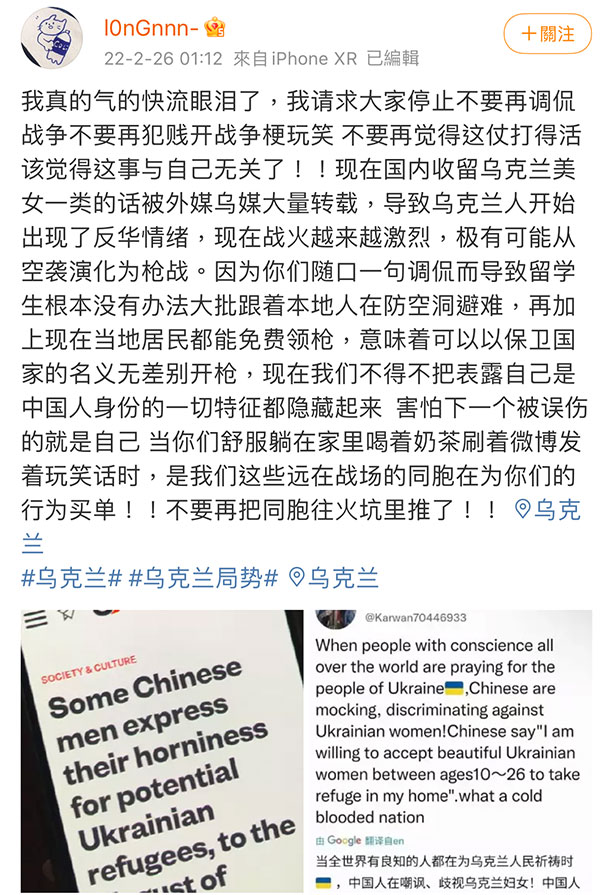 不少傳媒都有提到,在俄羅斯入侵烏克蘭期間,中國人在大陸社交網絡如微博等拍手叫好,並合理化入侵行為。其後,更有大量中國人在社交網絡「意淫」烏克蘭女性,並指願意收留云云。事件引發不少關注,有一名中國網民l0nGnnn-在網上發表文章,提到中國人在烏克蘭被敵視,又指烏克蘭因為中國人的低俗言論而出現反華情緒。