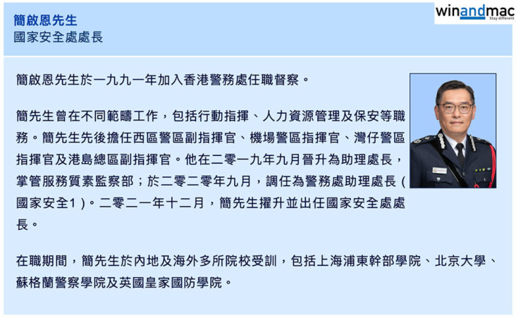 上年因為光顧無牌按摩店的蔡展鵬,原來於上年8月復職後,就調去人事及訓練處處長,國安處處長則由兩名國安處助理處長簡啟恩和江學禮署任。當時有報道已傳,簡啟恩將最有機會接任成為處長。日前,香港警務處網站終於更新資料,確認簡啟恩成為國安處處長。根據資料,簡啟恩曾在不同範疇工作,包括行動指揮、人力資源管理及保安等職務,先後亦擔任西區警區副指揮官、機場警區指揮官、灣仔警區指揮官及港島總區副指揮官。