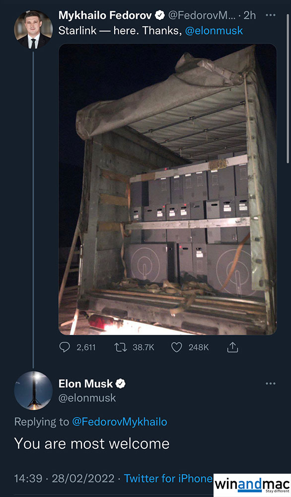 烏克蘭副總理兼數碼部長Mykhailo Fedorov於兩日前,曾希望Starlink衛星服務上網創辦人Elon Musk提供協助。Elon Musk當時在社交網絡爽快答應,並立即啟動烏克蘭地區的衛星上網服務,並指會有更多Starlink裝置送到烏克蘭。當時仍有人質疑,在這個打仗的時候,Elon Musk如何能把Starlink裝置送到烏克蘭是一個大疑問。