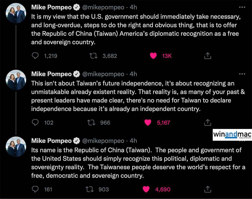 美國前國務卿Mike Pompeo近日訪問台灣,除了與台灣總統蔡英文會面外,亦應遠景基金會邀請,到台北君悅飯店發表演講。他促請美國政府應以外交承認中華民國台灣是自由主權國家,改變這種拖了很久、早就應該改變的外交政策。他強調,這不是要承認台灣獨立,這只是承認一個明確且早已存在的事實,台灣本身已是獨立的國家。