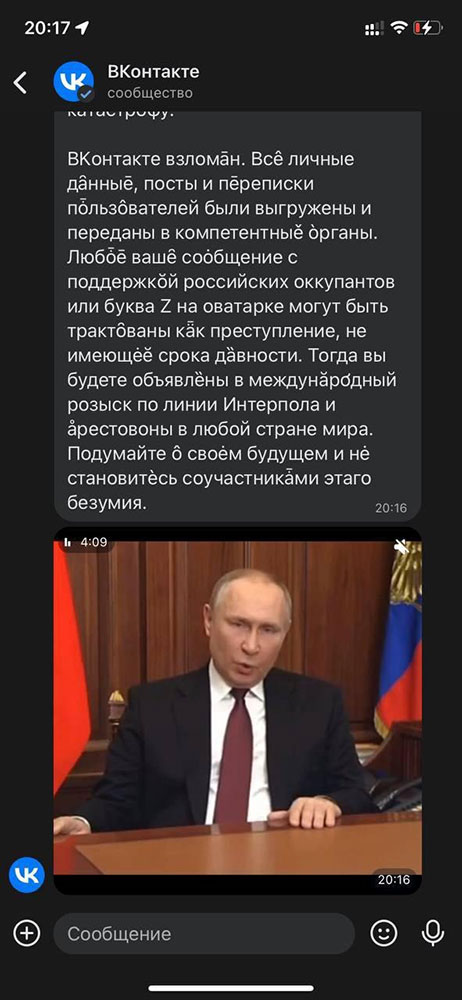 俄羅斯最多人用及最出名的社交網絡Vkontakte(VK),有烏克蘭傳媒報道指被入侵。有用戶開始從官方的VK戶口中,收到一系列的訊息(下圖),當中提到俄羅斯入侵烏克蘭的真相。當中亦包括俄羅斯入侵軍隊如何傷害平民,如何破壞經濟和為什麼要停止戰爭。