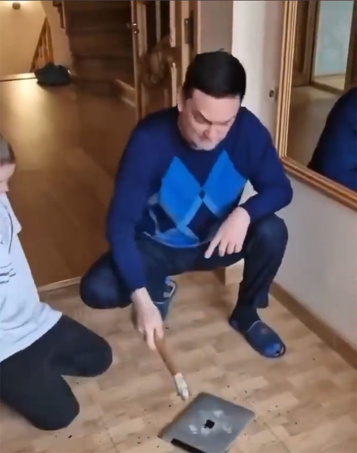他續稱,俄羅斯人不會害怕,他們會繼續生存,就算沒有蘋果這些「漂亮」的產品。說完後,就拿著搥狂打,打爆螢幕後再打爆機背。他更把搥交給兒子,叫兒子繼續打爆iPad。搞笑的是,這位父親最後竟然整損手。
