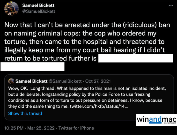 很多人以為外國人萬一被香港警方拘捕後,所獲得的對待可能比香港人好一點,但事實上並非如此。美籍律師Samuel Bickett當初被捕時,就曾受到酷刑對待,令他身體凍到送院,警方當時亦拒絕Samuel要求提供補暖衣物,亦無遵從律師指示。Samuel早前已經完成服役,現在已回到美國。數天前發表文章,公開當時宣佈下令對他實施酷刑,並恐嚇他的警員名字。目前香港有禁制令禁止公佈警員名字,Samuel稱他現在不怕被如此荒謬的法律禁制令影響,故此把其名字公開。