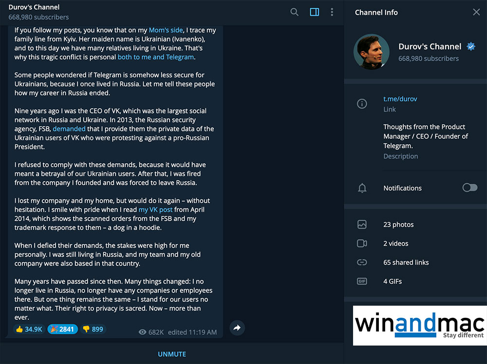 Telegram創辦人Pavel Durov反俄羅斯普京獨裁的行動,其實在科技界已經很著名,不少人都十分清楚。唯仍然有一些人,一聽到Telegram是俄羅斯人創辦,就發癲狂鬧,我們早前正式開啟winandmac Media Telegram頻道後,亦有一些人因此不滿,指我們「支持俄羅斯」。我們已經發表長文,再提一次Pavel Durov真前線兼串爆反普京的行動。如今,就連創辦人Pavel Durov本身,也發表文章重提他被逼流亡的故事。