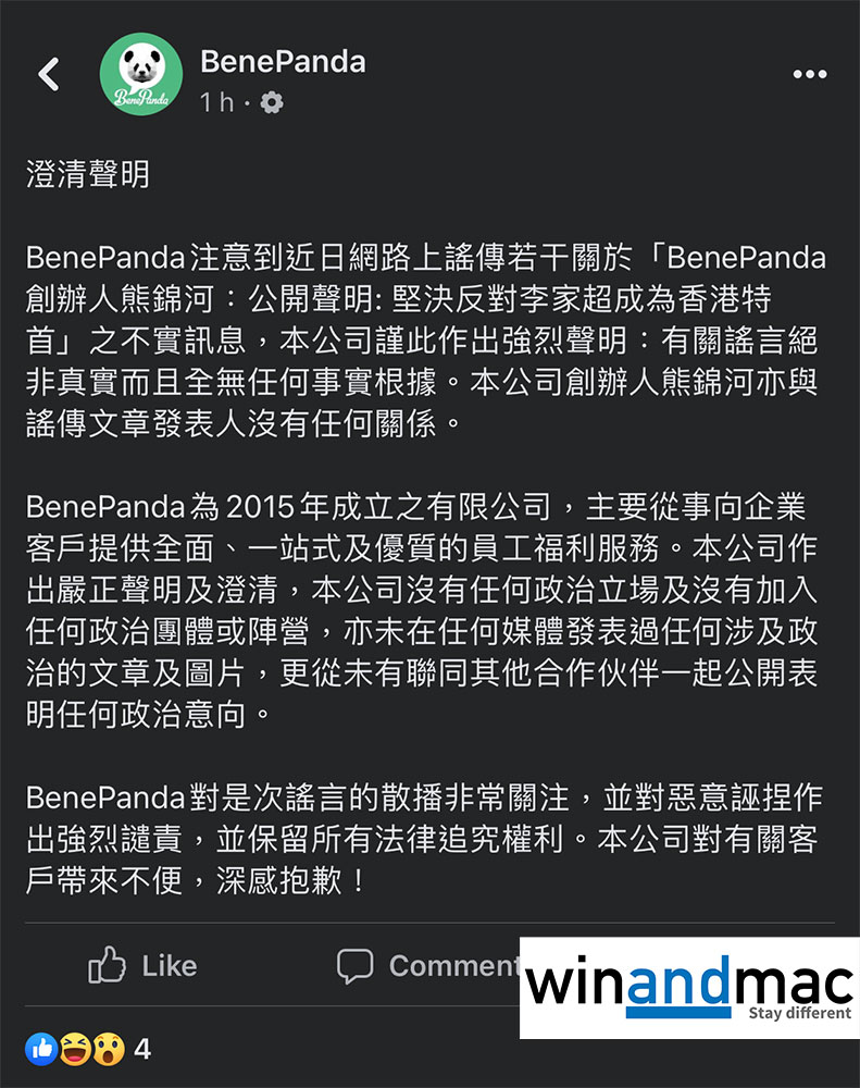 更新:BenePanda在社交網絡發表聲明,指有關謠言絕非真實而且全無任何事實根據,又稱創辦人熊錦河亦與謠傳文章發表人沒有任何關係。他們續指對是次謠言的散播非常關注,並對惡意誣捏作出強烈譴責,並保留所有法律追究權利,對有關客戶帶來不便,深感抱歉。
