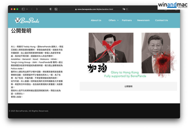 專門為員工爭取福利的平台BenePanda,於數小時前被網民發現,他們於4月22日在Newsroom發表新文章,公開表明堅決反對李家超成為香港特首。當中更提到「AsiaMiles、Generali、NowE、Watsons、HKMA、Tang’s Living Group、UMH、FoodPanda等」的合作夥伴的名字,並寫道「經過徵求本人的合作夥伴」,令網民聯想BenePanda是否與上述這些合作夥伴,一起合作發表聲明,堅決反對李家超成為香港特首。網站標題更加入「正式加入黃色經濟圈」一字。