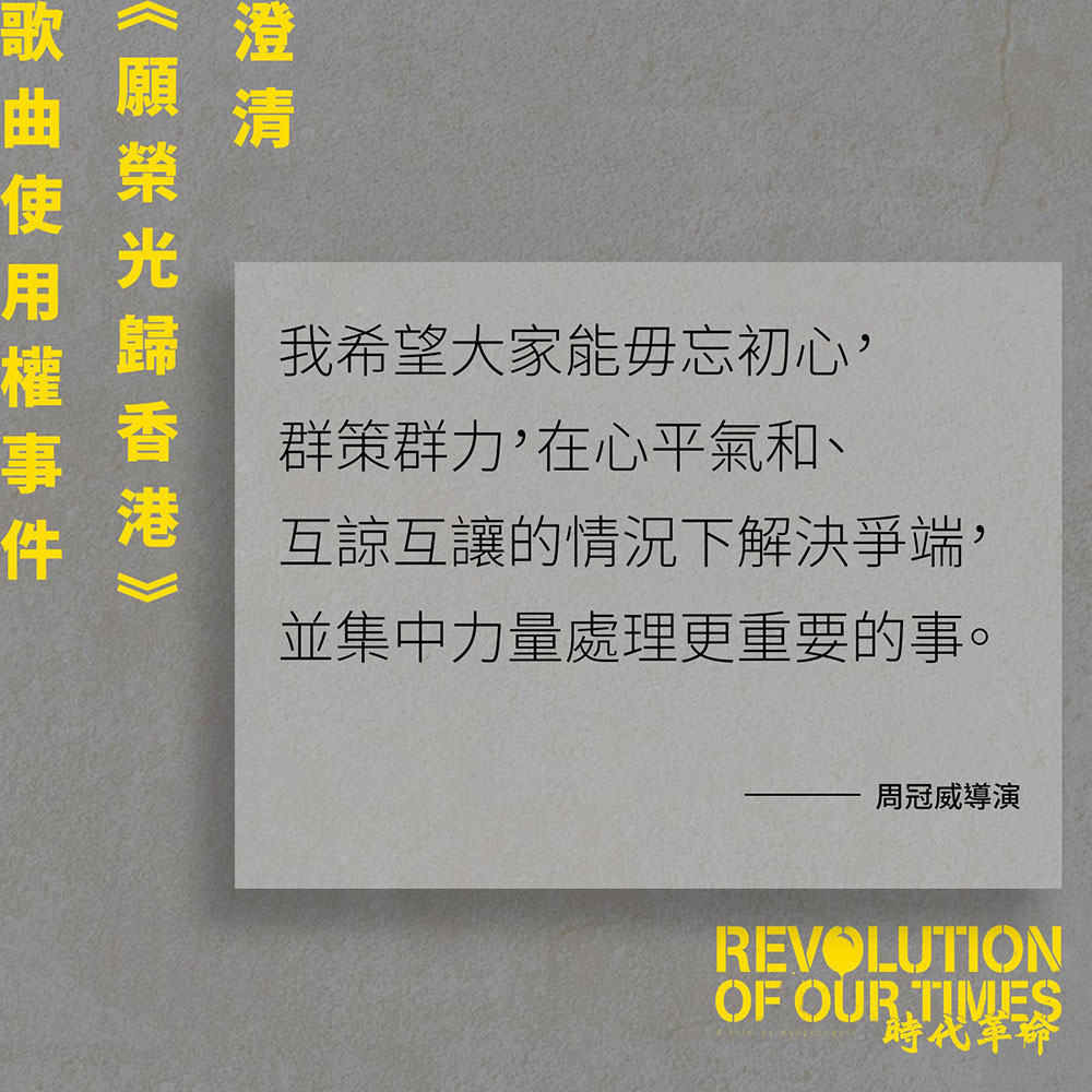 導演周冠威剛於《時代革命》官方專頁回應事件,提到當初電影剪完後,向黑方格BlackBlog詢問《願榮光歸香港》管弦樂MV的版權,黑方格當時答應並無收任何授權費用。周冠威當時以為黑方格與願榮光歸香港作曲人dgxmusic是同一團隊,於金馬影展放映期間收到dgx團隊Thomas查詢,才知悉有關事件,周冠威當時已立即向DGX的Thomas道歉,承認對於MV的誤會,並主動表明願意付版權費。