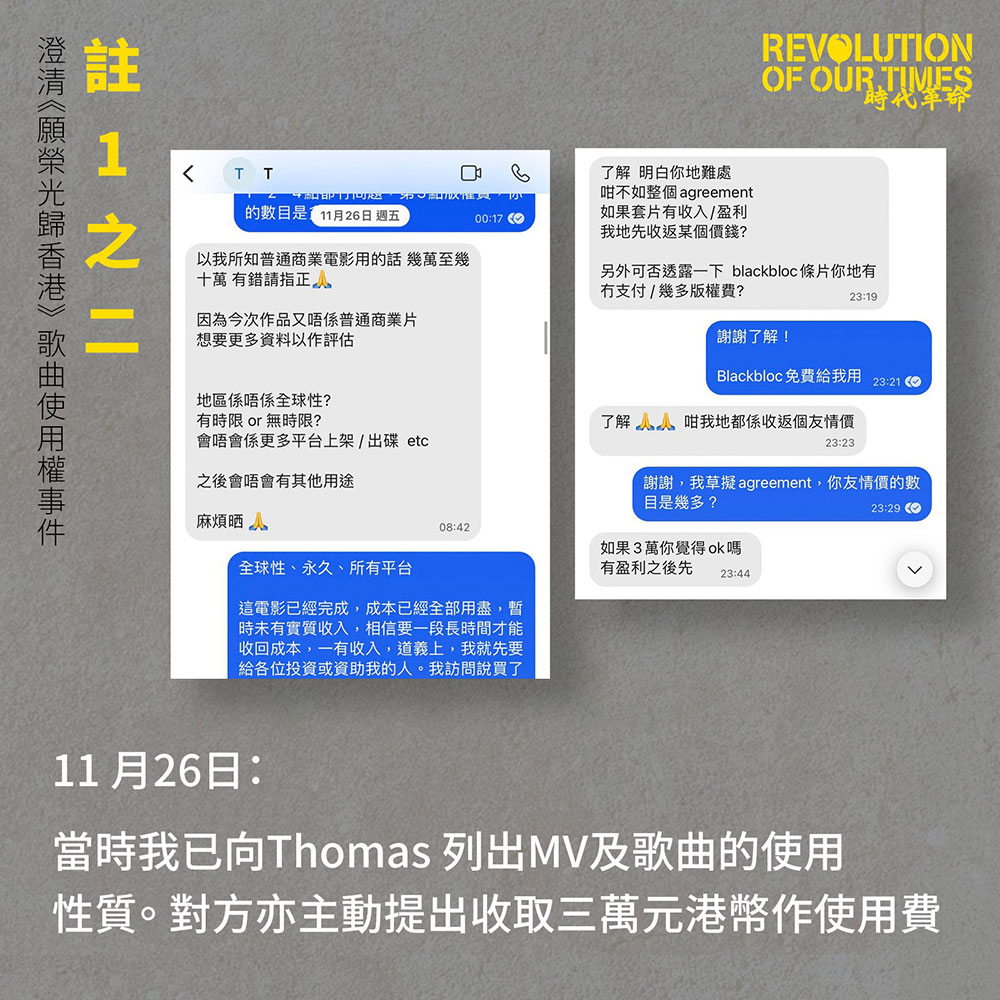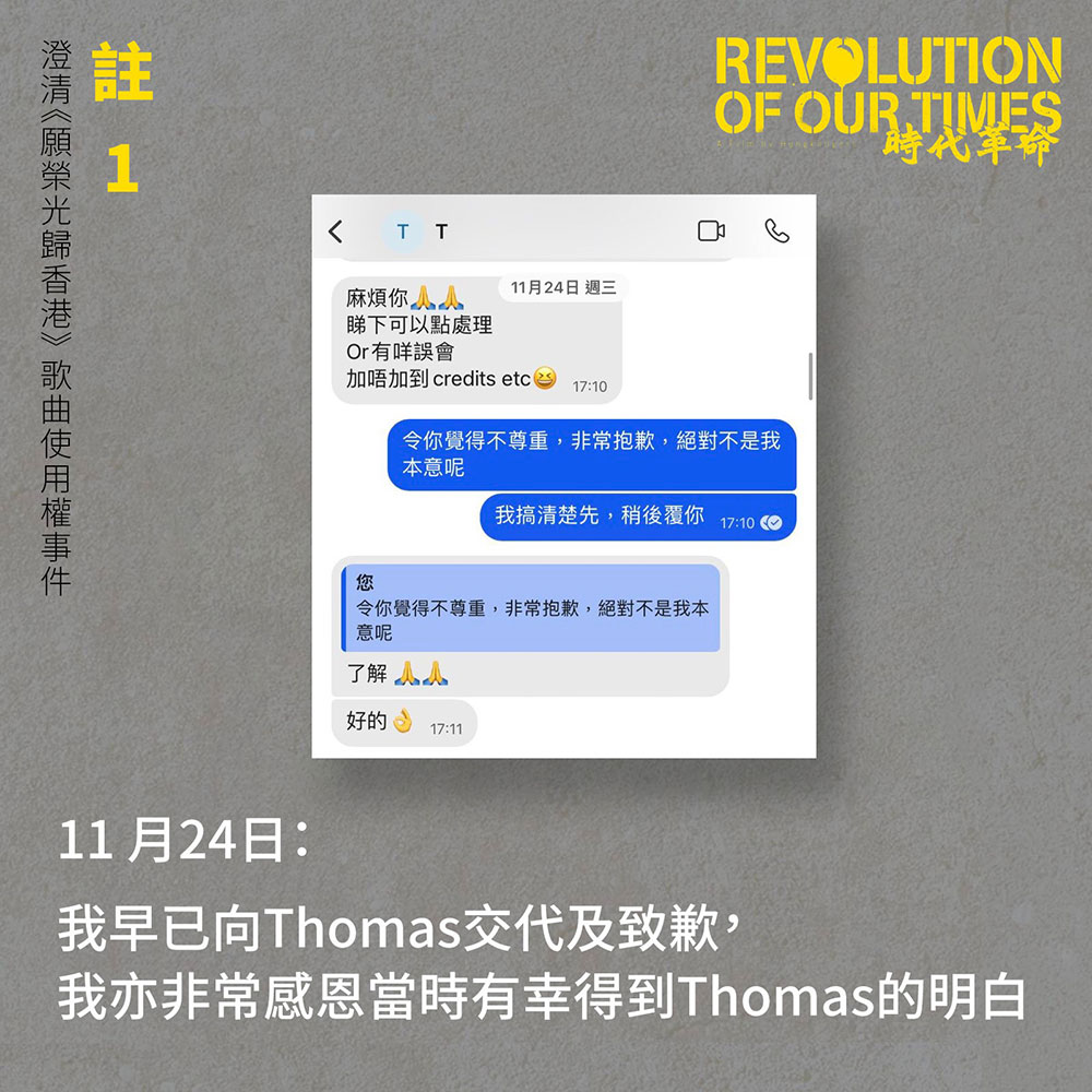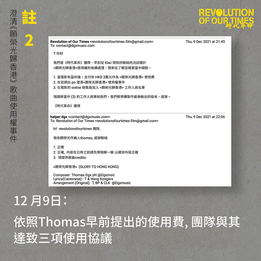 周冠威稱,於2021年11月26日,Thomas主動提出當電影有盈利之後,會收取版權費港幣3萬。《時代革命》團隊與Dgxmusic/Thomas於2021年12月9日,雙方確認版權問題達成協議。當時雙方亦同意,電影盈利後支付港幣三萬元使用費,在官網澄清相關版權爭議並致歉,在線上版本加入歌曲《願榮光歸香港》工作人員名單。