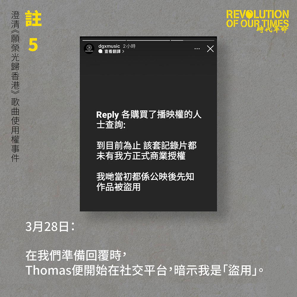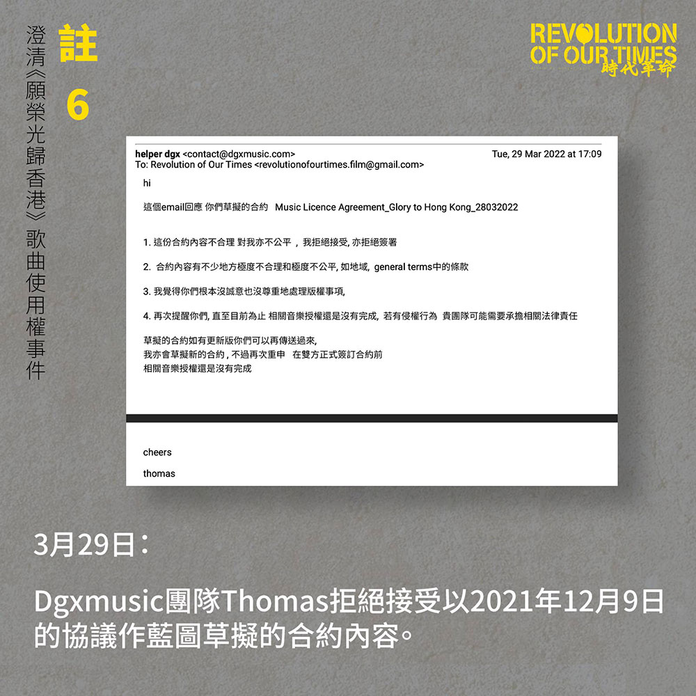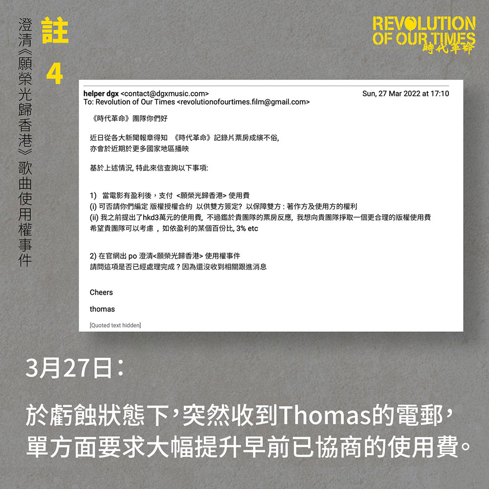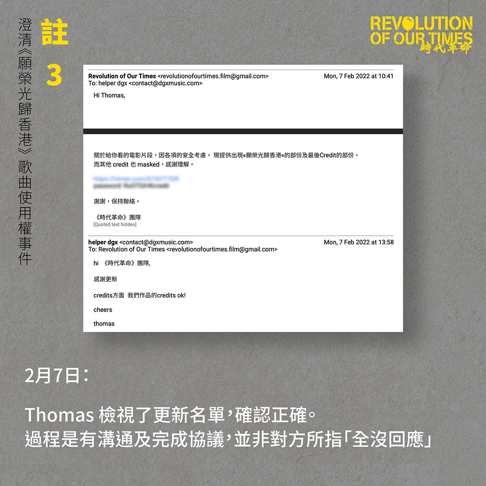 周冠威稱,於2021年11月26日,Thomas主動提出當電影有盈利之後,會收取版權費港幣3萬。《時代革命》團隊與Dgxmusic/Thomas於2021年12月9日,雙方確認版權問題達成協議。當時雙方亦同意,電影盈利後支付港幣三萬元使用費,在官網澄清相關版權爭議並致歉,在線上版本加入歌曲《願榮光歸香港》工作人員名單。