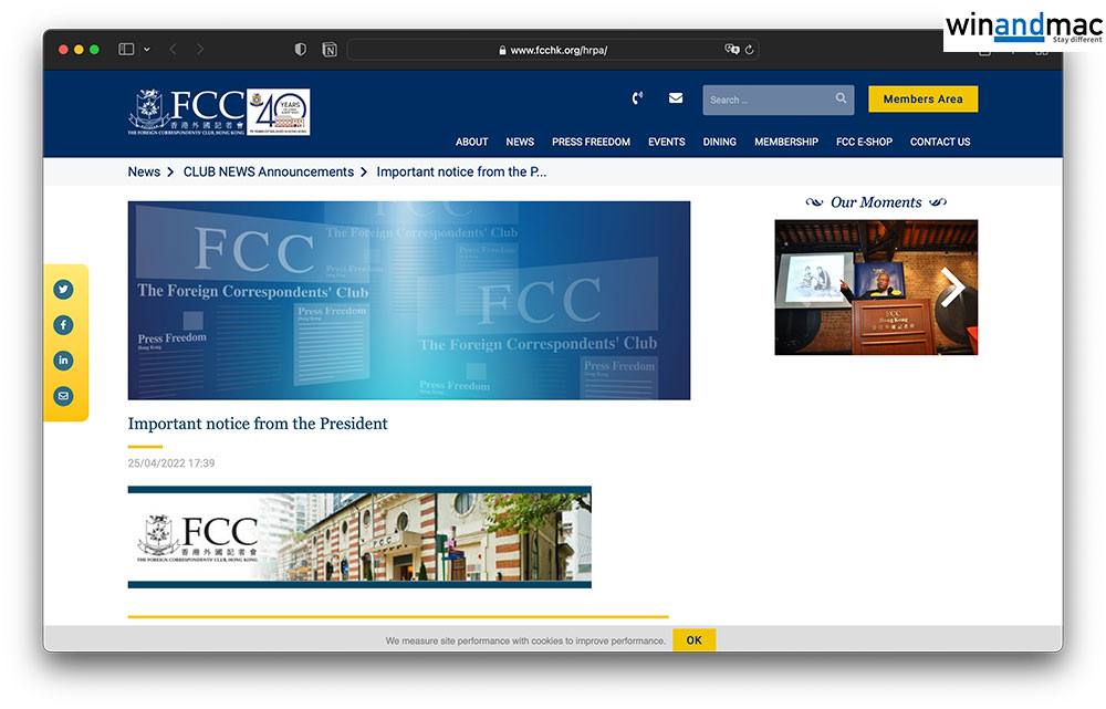 香港外國記者會FCC於較早前宣佈,今年將暫停舉辦人權新聞獎Human Rights Press Awards,通知中沒有提及停辦的詳細原因,唯提到他們在星期六有詳細討論,並指香港記者在過去兩年在新的紅線下工作,充滿一系列未知數,為免意外違反法例,決定暫停有關獎項。有小組成員公開表態,並反對外國記者會自行「河蟹」,辭任新聞自由小組抗議。