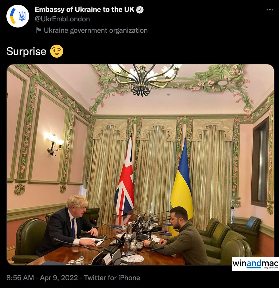 早前已有報道指,英國首相Boris Johnson研究能否親身去烏克蘭,表達對總統澤連斯基和烏克蘭的支持。數小時前,Boris Johnson真的在烏克蘭基輔現身,與澤連斯基見面,駐英國的烏克蘭大使館更風趣地寫上「Surprise」。他們除了會談外,也一起走進基輔街頭,與烏克蘭人民會面及聊天。Boris Johnson一開始就已經大讚澤連斯基是英雄,並指俄羅斯發動今次戰爭是不必要的。
