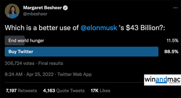 沒想到,美國一眾左派傳媒近日都沒有放過Elon Musk,不停誤導公眾。美國之音記者Margaret Besheer數小時前,更被懷疑有立場地開投票,問Elon Musk的US$430億資金的更好用處,是解決世界飢餓問題,抑或是買起Twitter。網民也似乎不賣帳,高達88.5%的人認為Elon Musk應該用來買Twitter。