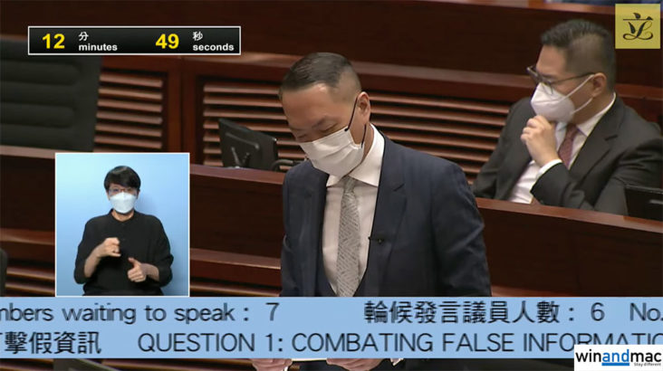 有不少網民都認為,李家超在特首「選舉」中勝出後的宣言中,「香港呢一個家」抑或是「香港呢個國家」事件,李家超兩天都無回應是想冷處理,香港人很快就不會再討論。唯建制派親中人士則不放過此機會,不停炒作事件,工聯會會長吳秋北早前就老屈「黃媒加工」,今日立法會大會中,經民聯吳永嘉(上圖)則再一次提起有關事件,並向在場的保安局局長鄧炳強問到何時會立法管制「假資訊」。