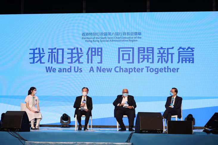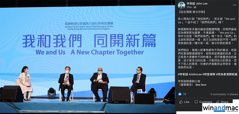 唯一特首參選人的李家超,於日前搞記者會時,放上一個叫「我和我們 同開新篇」的口號,英文翻譯為「We and Us A New Chapter Together」。口號出街後隨即引發不少網民恥笑,因為這樣就似乎把「我」譯做「We」(正確應為Me),亦有一些網民開玩笑稱「We (Hong Konger) and US(美國)」。