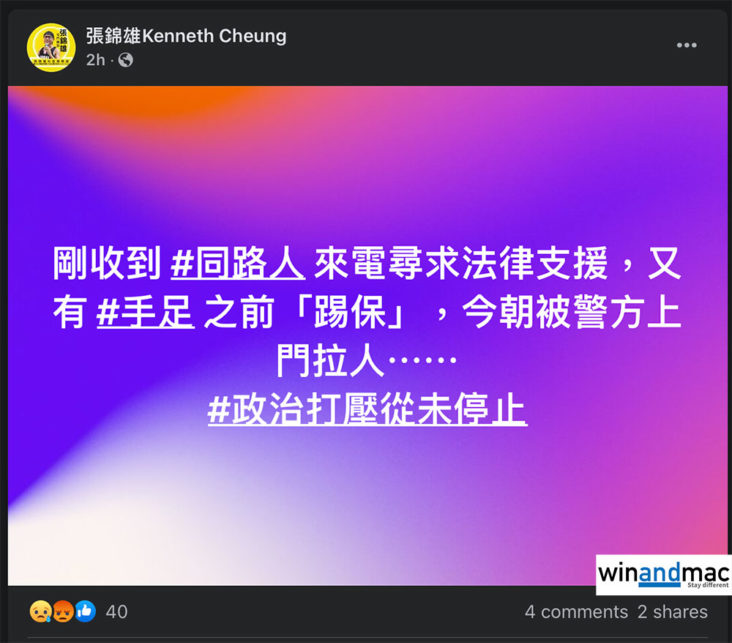 前屯門區議員張錦雄今天於社交網絡中提到,有曾踢保的手足於今早再次被警方拘捕,他亦有收到同路人致電尋求法律支援,他亦稱政治打壓從未停止。據本站記者消息所得,有可能與2020年中於旺角發生的事件有關,被捕人士多被控非法集結罪。本站記者正嘗試向警察公共關係科了解,如有更新會在這裏發佈。