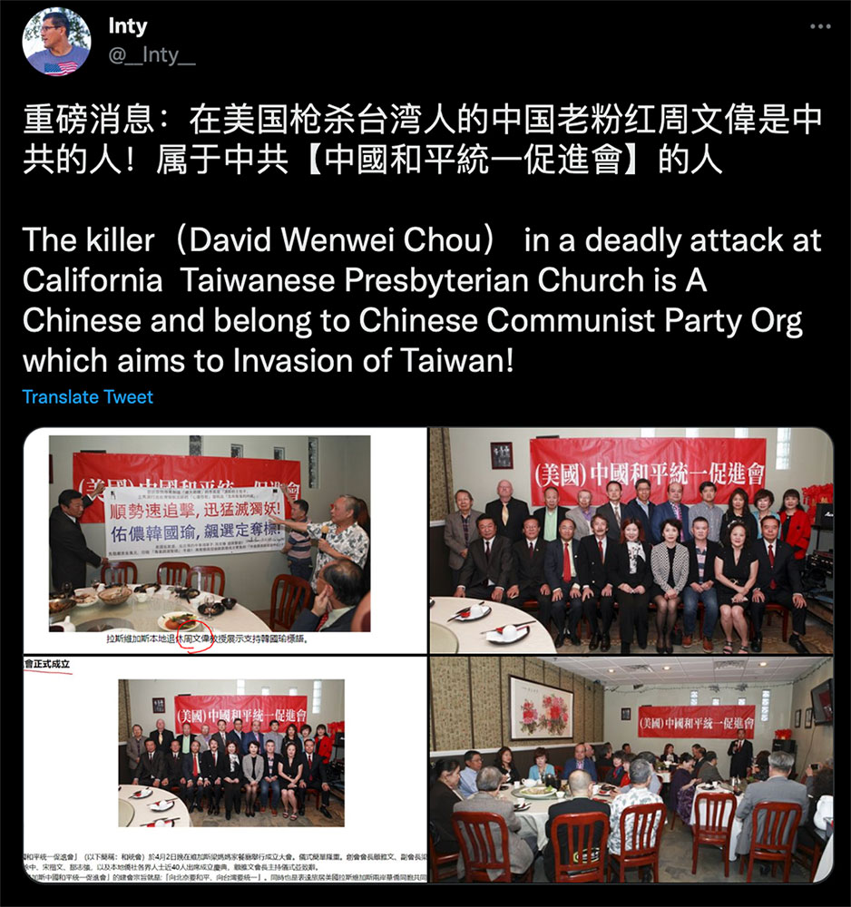 美國獨立媒體人兼YouTuber Inty表示,周文偉為當地中共「中國和平統一促進會」的成員,並且是「老粉紅」。Inty亦提到,被槍擊的教會與台灣獨立運動及民進黨有深厚的關係。