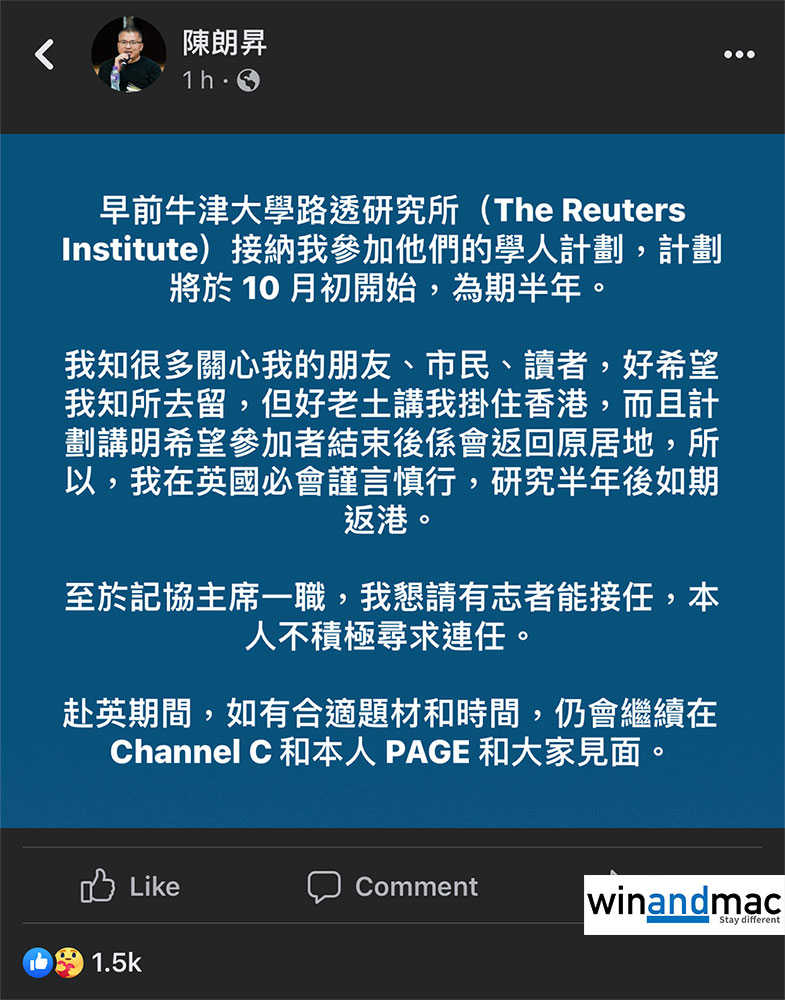 目前仍為香港記者協會主席的陳朗昇,間唔中仍在一些新開的網絡媒體如Channel C與大家見面。他於數小時前在社交網絡宣佈,將於9月底離開香港,參加10月初英國牛津大學的路透研究所The Reuters Institute的學人計劃,計劃為期半年。陳朗昇表明讀完之後會返港,因「好老土講我掛住香港」,而且計劃講明希望參加者結束後返回原居地。他強調,自己在英國必會謹言慎行,研究半年後如期返港。