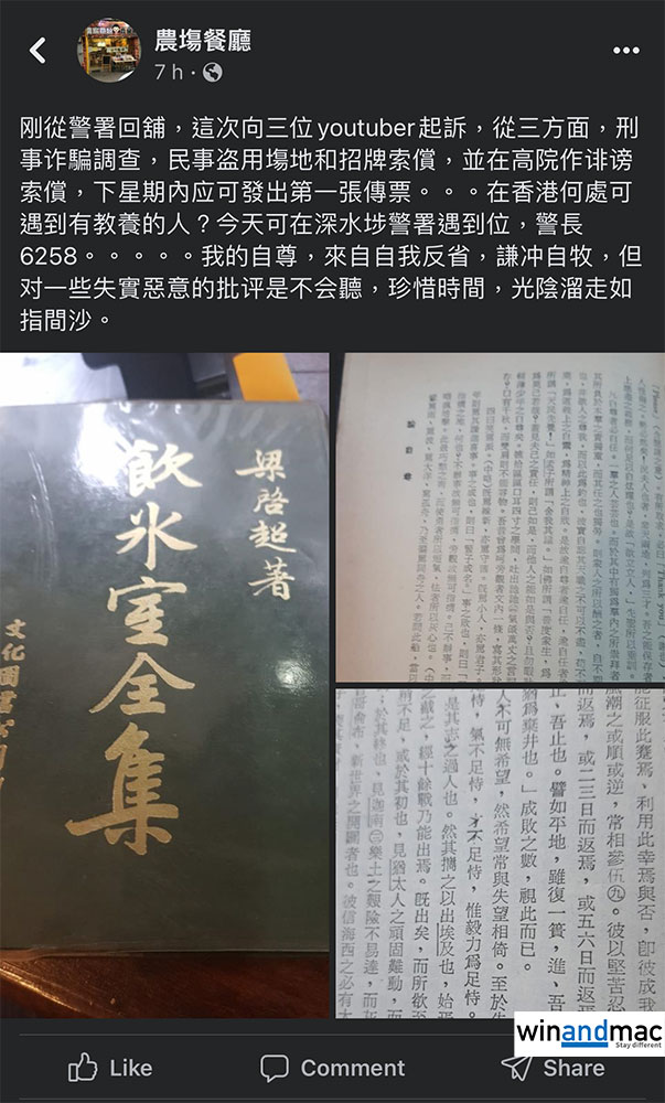 結果,有關留言真的是來自陳興濤,陳興濤亦於早前在農場餐廳的社交網絡專頁,指已經去警署報警,並用繁簡體混合去稱「對一些失實惡意的批評是不會聽」。農場餐廳的社交網絡專頁於近幾日亦不停發表新文章,稱要加同事人工,又指「任八方風雨,依法律而行而去起訴。」,今天又用繁簡混合去稱「今早發動了第一套馬車去西九龍法庭,已順利完成任務,上庭的日期和地點,明天會刋於am730….」。涉事的9BoThew於數小時前在YouTube和社交網絡表示,感謝大家關心,並指事件已經進入法律程序的話,不方便回應大家。