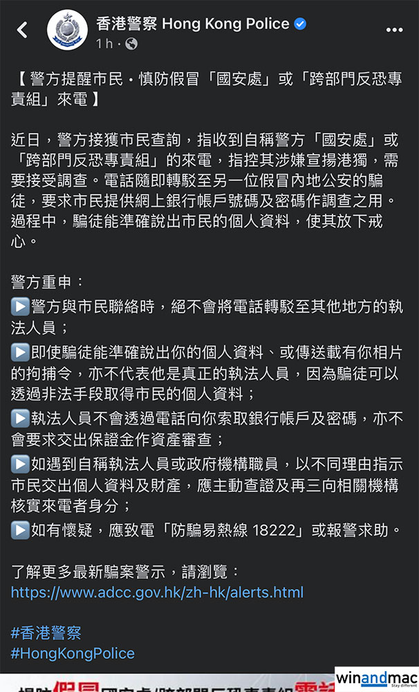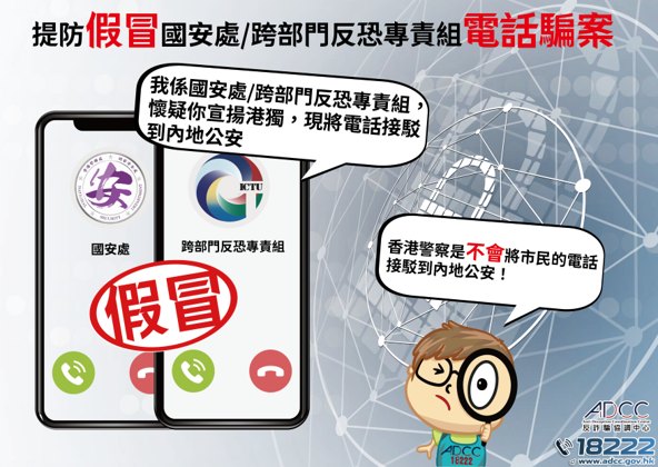 香港警察在社交網絡上提到,最近有市民收到自稱警方「國安處」或「跨部門反恐專責組」的來電,指控其涉嫌宣揚港獨,需要接受調查。有關來電更隨即轉駁至另一位假冒內地公安的騙徒,要求市民提供網上銀行帳戶號碼及密碼作調查之用。有關騙徒更能準確說出市民的個人資料,使市民放下戒心,並信以為真。