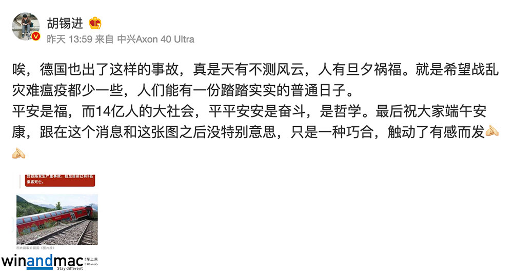 黨媒重要人物胡錫進突然發表文章,提到南部有德國列車出軌,造成3人死亡事件。他在字裏提到「4億人的大社會,平平安安是奮鬥,是哲學。」,令網民覺得胡錫進是否要暗示中國比德國平安得多。可惜的是,回力鏢真快手,今天輪到大陸發生類似的列車出軌事件。