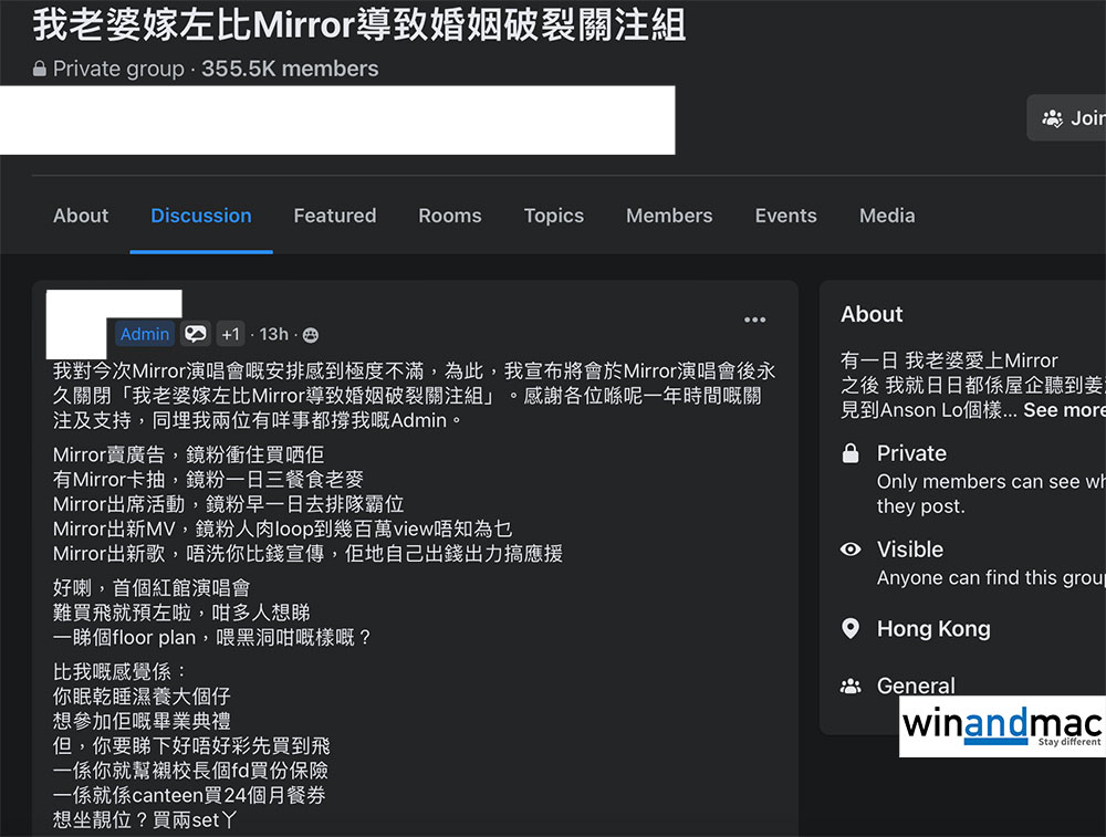 「我老婆嫁左比Mirror導致婚姻破裂關注組」Facebook Group在男子組合Mirror爆紅時,亦跟住爆紅。在外面仍在爭論Mirror幫麥當勞賣廣告事件時,有關Facebook Group有不少人都爭住購買Mirror有份代言的產品,據稱麥當勞等有搵Mirror拍廣告的,都成功在社會事件後「翻身」。Mirror原定在今年7月舉行演唱會,日前在Group中有不少人搶飛。數小時前,該Group的版主忍唔住爆Seed,稱對於演唱會安排十分不滿,並聲言在Mirror演唱會後關閉這個超過35萬人的Facebook Group。