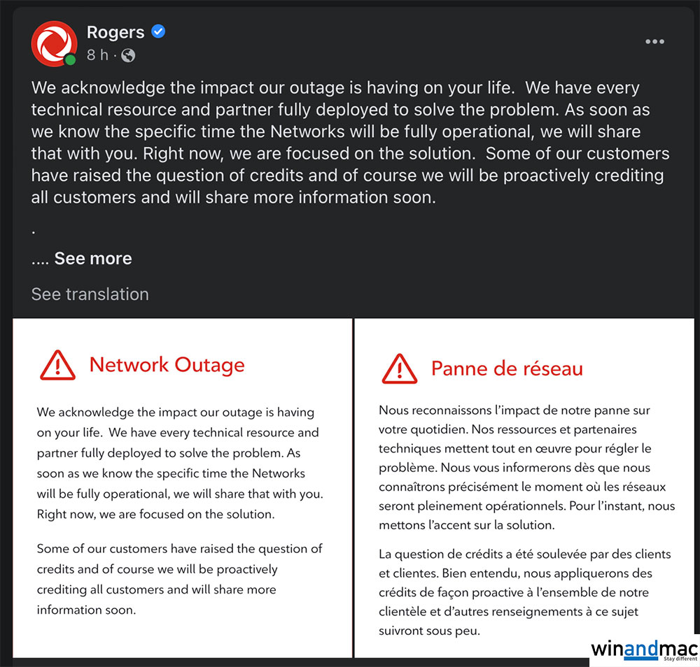 加拿大電訊商Rogers於當地時間星期五突然出事,流動電話服務與家居上網服務等完全無法正常運作,而且最大鑊的是,持續時間由當地星期五零晨至晚上。由於Rogers在加拿大當地有近乎全壟斷的地位,加拿大有大量服務都依靠Rogers網絡運作。Rogers死機後,當地無論Debit卡或信用卡都完全用唔到,大量店舖只能收現金,甚至乎被逼關門暫停營業,多倫多有商場店舖包括KFC等食肆都因此而暫停營業。最慘的是,當地有不少ATM提款機都因網絡出事而用唔到,市民要拎現金都並不容易。