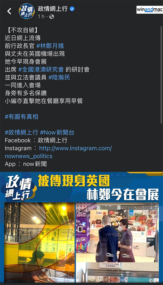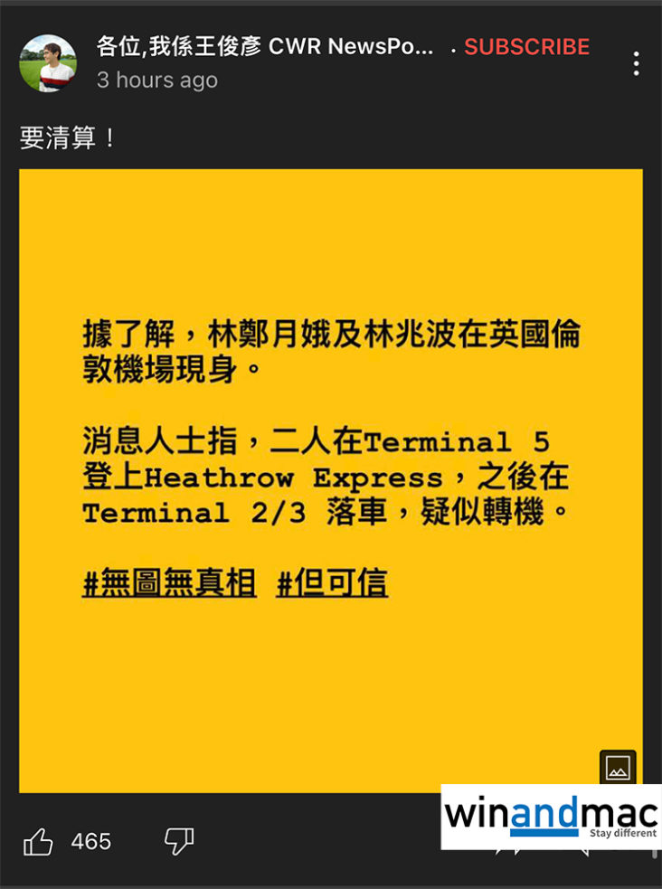前無綫新聞主播王俊彥於上星期突然在多個平台發表文章,指有消息稱林鄭月娥與其丈夫林兆波於英國倫敦機場現身,兩人在Terminal 5登上Heathrow Express,然後在Terminal 2/3落車,似乎轉機去其他地方。唯王俊彥至今都沒有發表任何相片,更在原文中寫道「無圖無真相」,但又寫道「但可信」。