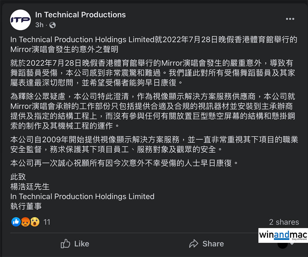 而另一間被指是大陸公司的In Technical Production(ITP),亦透過社交網絡發表聲明,表明工作部份只包括提供合適及合規的視訊器材,並安裝到主承辦商提供及指定的結構工程上。他們並沒有參與任何有關放置巨型懸空屏幕的結構和懸掛鋼索的制作、及其機械工程的運作。ITP稱自2009年開始提供視像顯示解決方案服務,並一直非常重視其下項目的職業安全監督,務求保護其下項目員工、服務對象及觀眾的安全。