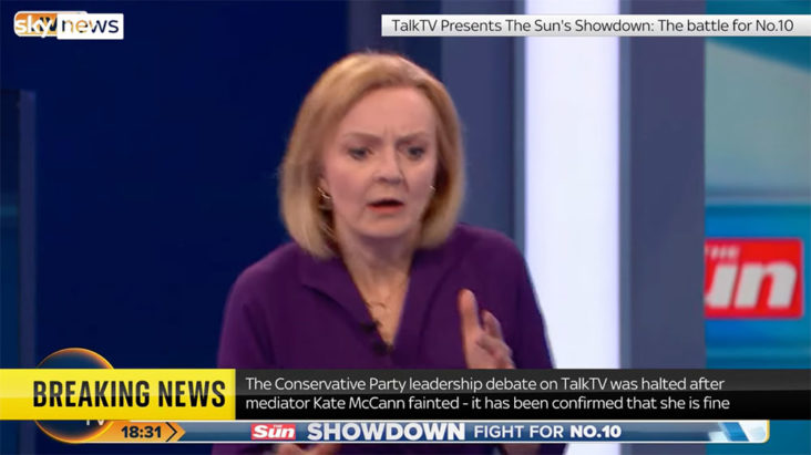 保守黨黨魁最後兩名候選人,包括Liz Truss與Rishi Sunak,於當地時間星期二26號上TalkTV進行電視辯論。唯辯論進行約半小時後,主持人Kate McCann突然暈倒。當時Liz Truss正回答主持人有關俄羅斯的問題,Liz Truss都被Kate突然暈倒嚇親,當時Kate暈低後倒地時發生巨響,Liz Truss其後向前查看Kate的情況。