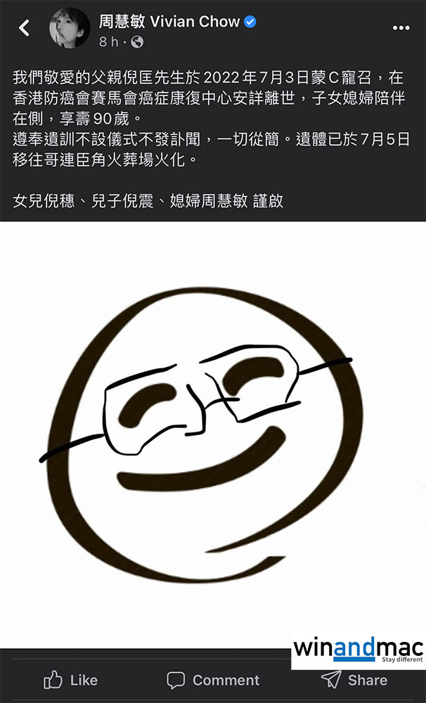 倪匡已於7月5日火化  周慧敏按遺訓從簡