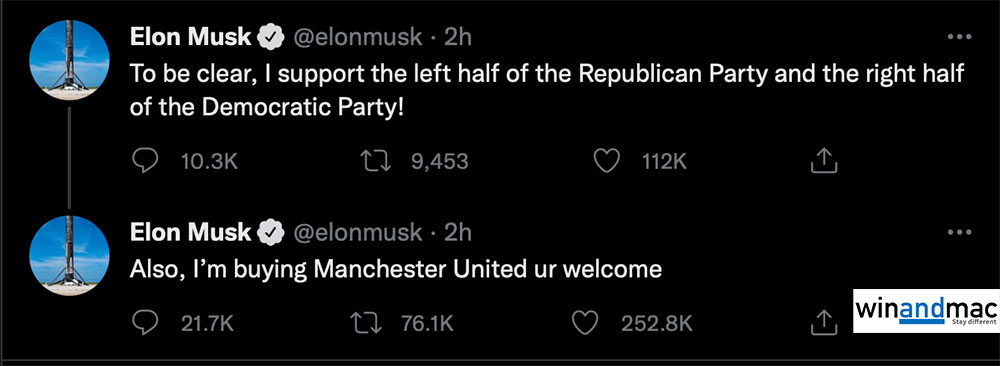 Elon Musk早前縮沙唔買Twitter後被告,但最近先贏一仗。法庭要求Twitter從前員工Kayvon Beykpour中,向Elon Musk的一方提供資料。近日風騷的他,數小時前在Twitter更發表文章,表明將收購曼聯,並叫大家不用客氣。據報道稱,曼聯支持者在今年就曾向Elon Musk公開要求,希望這位全球首富買起曼聯,以便拯救這個沒落的英超球會。
