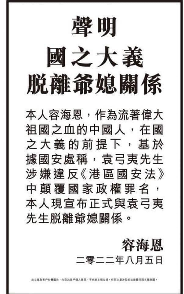 有關廣告以「國之大義」為標題,內文則寫著「本人容海恩,作為留著偉大祖國之血的中國人,在國之大義的前提下,基於據國安處稱,袁弓夷先生涉嫌違反《港區國安法》中顛覆國家政權罪名,本人現宣布正式與袁弓夷先生脫離爺媳關係。」。容海恩亦回應了傳媒查詢,指其丈夫袁彌昌知情及理解。