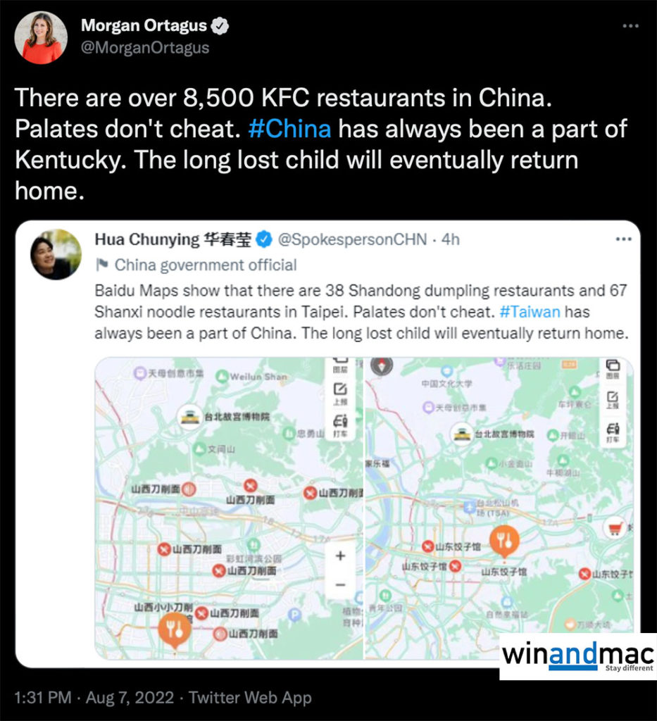 中國外交部發言人華春瑩早前以英文在Twitter上發表文章,指台北市有山東餃子館38間,以及山西麵館67間,又說味覺不會騙人,台灣一直都是中國的一部分,失散多年的孩子將會回家,有關文章更附近百度地圖。唯有關文章一出,美國國務院前發言人Morgan Ortagus(上圖右),也忍不住用同樣的句字方式回應,但就換上中國的內容。她寫道中國有超過8500間肯德基,中國是美國肯塔基州的一部分。