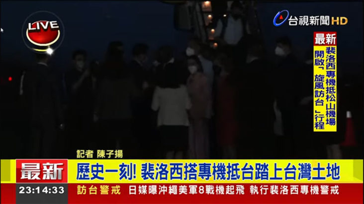 由美國眾議院議長佩洛西Nancy Pelosi未出發訪台就嘈的中國,原本不停強調若佩洛西真的訪台,會有軍事行動,外交部趙立堅更聲稱中國人說到做到。在佩洛西飛機起飛前往台灣時,有報道指中國在台灣附近進行一系列的軍事滋擾,並調動大量軍隊,似乎真的準備好攻打台灣。結果,正當全世界擔心中國是否真的會在今晚攻打台灣的時候,佩洛西的專機於台灣晚上10:43pm成功到達松山機場,無穿無爛,由台灣外交部等官員迎接,其後佩洛西等人已出發往台灣君悅酒店,料明天將與台灣總統蔡英文會面。中國外交部發表聲明,表示對此堅決反對,嚴厲譴責,已向美方提出嚴正交涉和強烈抗議。