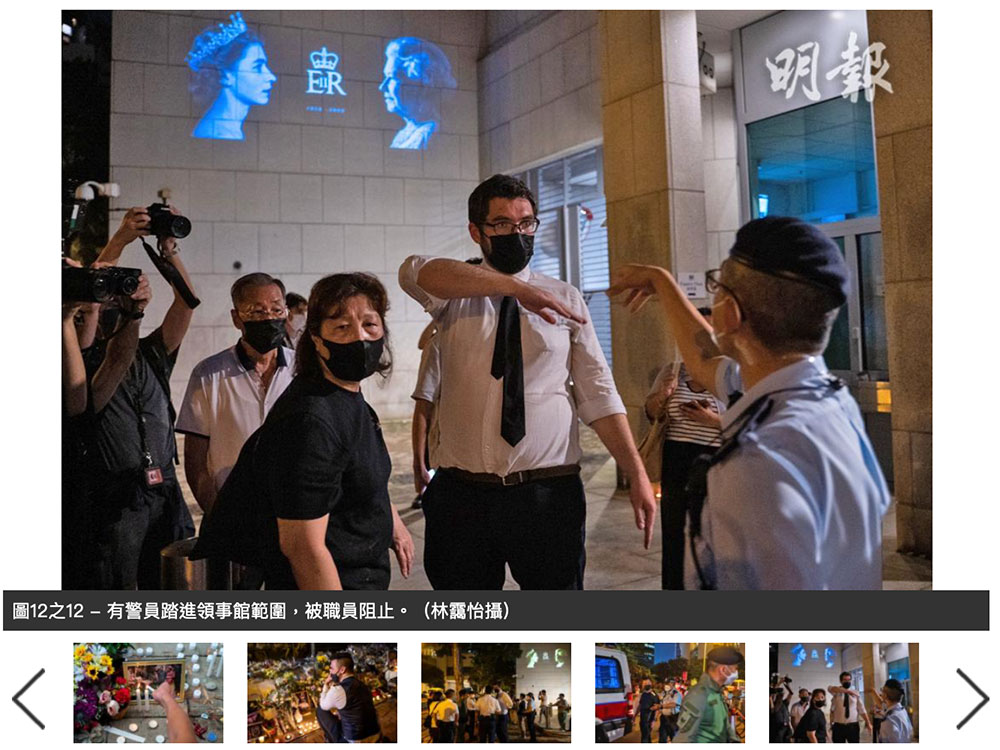 昨天晚上九點左右,紀元香港與明報均拍到一名男子,因為在英國駐港總領事館外吹口琴,遭警員截查後被捕。據稱,該名男子曾在現場吹奏英國國歌,當時現場氣氛高漲,過了不久後警方就進行截查。當時曾有警員踏進領事館範圍,但被職員阻止。