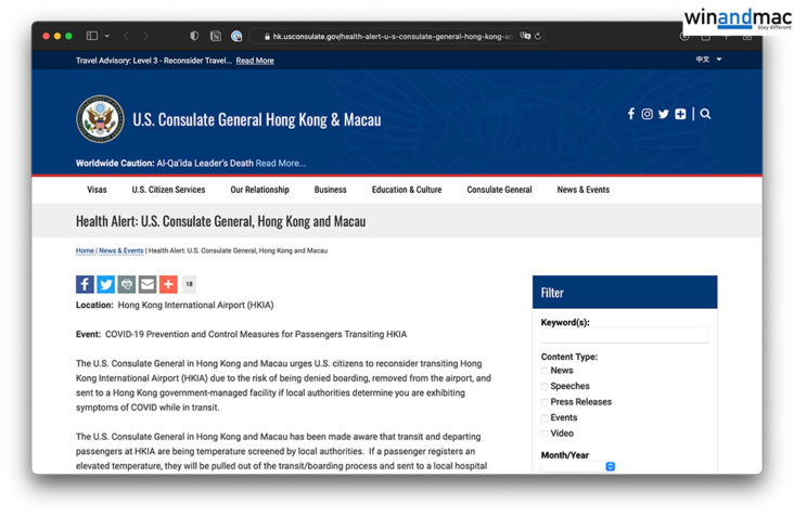 領事館促請美國公民考慮這些風險,重新考慮是否要經香港轉機。若不幸被送到隔離措施,又或離開香港時有困難,領事館促請國民盡快向他們求助。