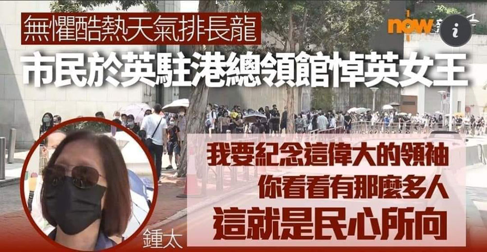 自從TVB前新聞部高層陳鐵彪入主now新聞後,now新聞的公信力就受到質疑。早前已經試過突然刪除前國安處處長蔡展鵬去骨場報道,近日又再一次河蟹,今次輪到大批市民去英國駐港領事館的報道。now新聞原報道中訪問了一位叫鍾太市民,鍾太稱要去紀念英女王這位偉大的領袖。記者其後問「點解」,鍾太續指「你睇下咁多人就知啦」,又說「係呀,呢個就係叫民心,民心所向呀」。
