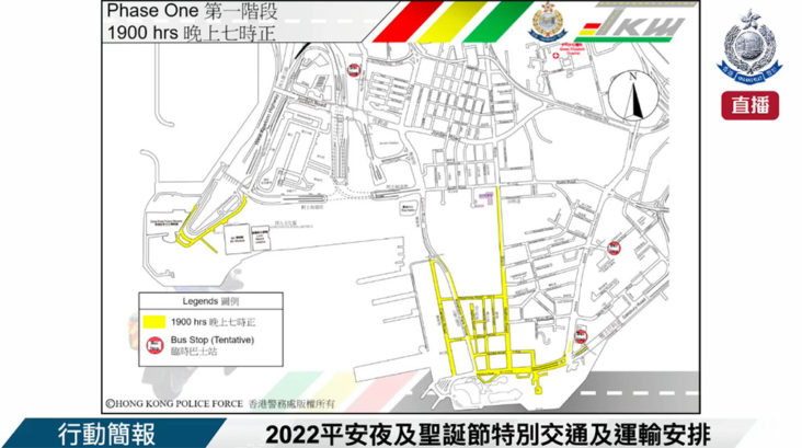 經歷了長時間的防疫後,明天聖誕節平安夜相信將吸引大量人流出外慶祝,警方在今早記者會亦稱「市民餓咗好耐」,指大家都想出外「行吓聚吓」。警方將由12月24日2:00pm開始至25日5:00am,開始封閉雲咸街至威靈頓街的德己立街、蘭桂坊榮華里、和安里、介乎雲咸街及德己立街的威靈頓街和安蘭街。屆時,雲咸街北行車輛只能往皇后大道中方向行駛,不可左轉進入德己立街及威靈頓街,也不可以右轉駛入安蘭街。