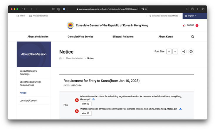 大陸人前往韓國時,抵達後就被韓國當局要求戴黃卡,而且由軍人陪同,大陸網民痛罵韓國當局。此外,今天韓國駐港總領事亦在網站宣佈,由1月10日起,港澳航班飛韓國都要統一用仁川機場降落,嚴重影響香港出發的多班航班。結果,中國宣佈反制,由即日起,中國駐韓國領事館將停止簽發韓國公民去中國的多種短期簽證,包括訪問、旅遊、商務、就醫、過境及私人事務。