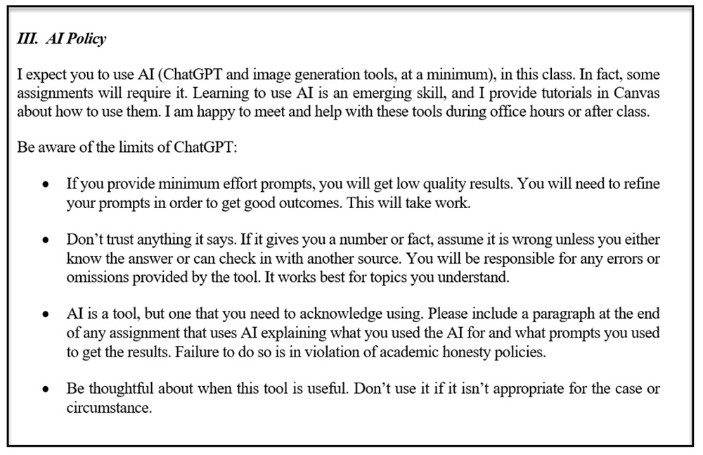 另外,他亦要求學生在使用人工智能後,必需加入相關的標註,交代如何使用並如何得出有關結果。他提醒,若不適宜用人工智能工具的話,就不要使用。Ethan發現若果沒有經過訓練,學生和所有人都會亂用人工智能工具,求其打簡單內容,得到差劣的結果。經訓練後,學生們學會如何好好使用人工智能工具,例如問得更有技巧,加入更多指示,獲得更好的結果。