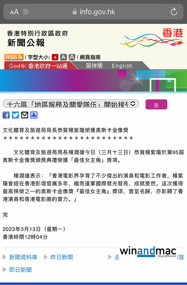 馬來西亞華裔演員楊紫瓊以《奇異女俠玩救宇宙》獲奧斯卡最佳女主角,正式成為首位華人影后。文化體育及旅遊局局長楊潤雄亦緊急發稿,稱恭賀楊紫瓊於第95屆奧斯卡金像獎頒獎典禮榮獲「最佳女主角」獎項。稿內強調楊紫瓊為「香港演員」,彰顯了香港演員和香港電影圈的實力,並指香港電影界孕育了不少傑出的演員和電影工作者。