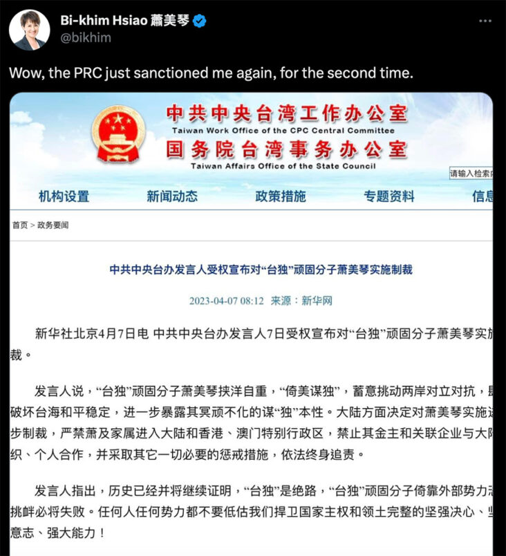 台灣總統蔡英文成功訪問美國,並與美國眾議長麥卡錫等重要政治人物見面,同行的亦有多名台灣代表,包括台灣駐美國代表蕭美琴。中共在蔡英文未到埗前已經鬧爆,今日中共正式宣佈制裁蕭美琴,並指她「倚美謀獨」,嚴禁她與家屬進入大陸和港澳,禁止其金主與關聯企業與大陸組織或個人合作等。除蕭美琴外,遠景基金會和亞洲自由民主聯盟亦被中共點名,並受到類似制裁。