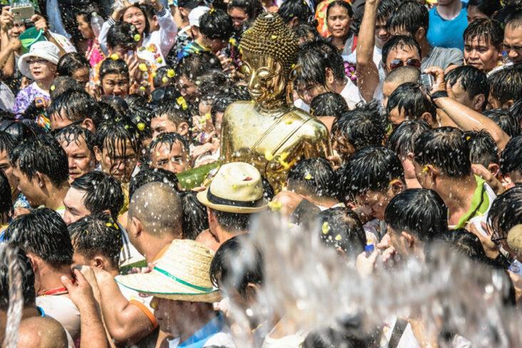 在泰國潑水節,人們通常會向佛像潑水以示尊敬和祈求新一年的祝福。這種潑水儀式代表著淨化、祈求降雨和冀望帶來好運。潑水節期間,人們還會向長者潑水,表示尊敬和祝福。逐漸地,這個節日變得越來越歡樂,人們也在街上互相潑水,不僅僅是家人和親朋好友,連陌生人也會互相潑水以示祝福和友好。