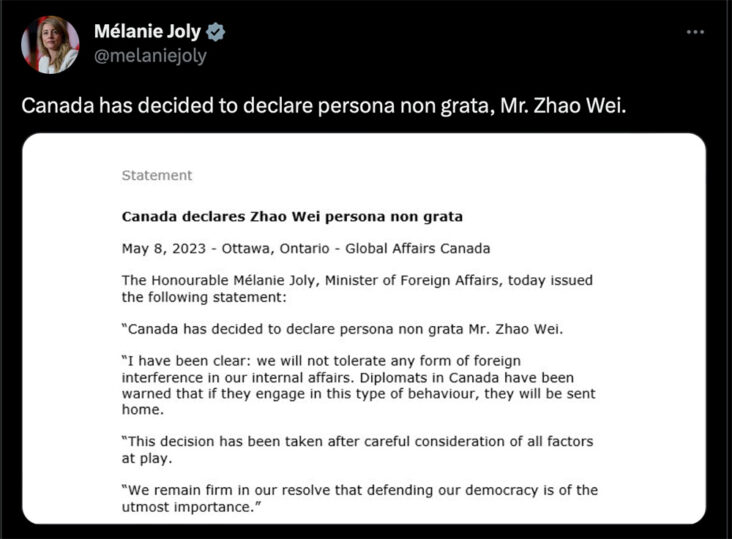 結果,今日加拿大外長Melanie Joly宣佈,正式驅逐中國駐加拿大領事館外交官趙巍。她表示,早前已經對有關人士作出警告,不會再容忍有關中國干預加拿大內政行為。