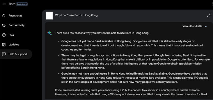 身在英國的本站記者曾用Google Bard查詢有關問題,有趣的是Google Bard也鼓勵大家透過VPN使用這個新的人工智能搜尋引擎,與ChatGPT主動封鎖VPN做法似乎有點不同。
