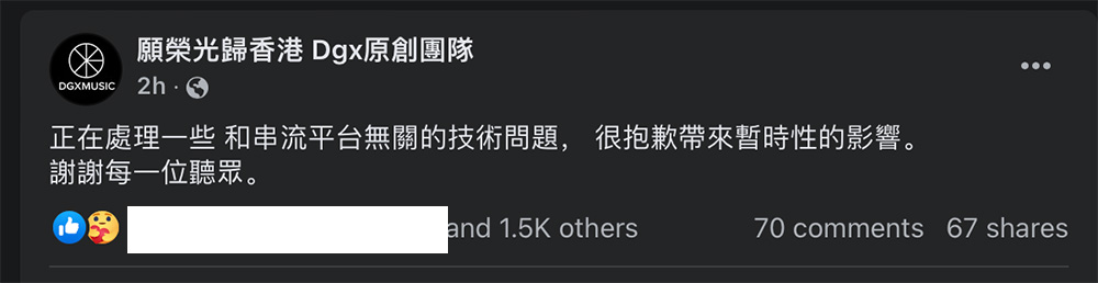 早前有網民發現,被人稱為香港國歌《願榮光歸香港》突然在iTunes音樂商店消失,被網民懷疑蘋果是否在禁制令未生效前,就極速跪低。其後Apple Music只剩下台語版,Spotify與KKBOX等串流平台也找不到《願榮光歸香港》。原音樂創作團隊dgxmusic晚上在社交平台宣佈,正在處理一些與串流平台無關的技術問題,「很抱歉帶來暫時性的影響。」