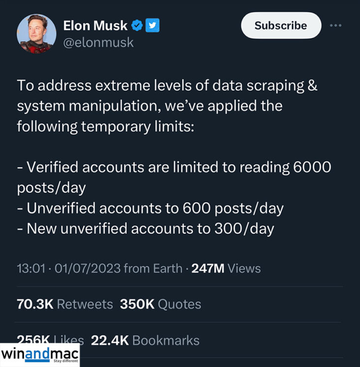 當年Twitter被Elon Musk掌權後,不少人認為其緊縮開支的政策叫好。可是,Elon Musk竟然宣佈,已認證的用戶(即有俾錢訂閱Blue或經特別渠道免費取得)每日只可以睇6000篇內容。至於沒有付錢的用戶,每日只可以睇600篇內容。新註冊又沒有付錢的用戶,每日則只可以睇300篇內容。社交網絡平台一直都追求用戶停留時間愈長愈好,今次Twitter做法可謂相當有趣。