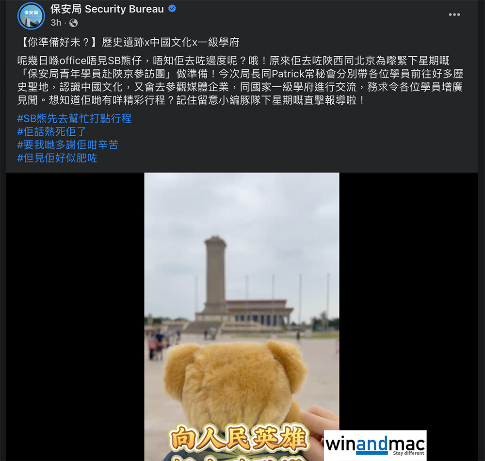 保安局今日發佈影片,提到該局的所謂吉祥物「SB熊仔」去了陜西與北京,為下星期的保安局青年學員赴陝京參訪團做準備。文章亦預告保安局局長鄧炳強和常任秘書長李百全,將會分別帶領各位學員前往不同歷史名勝,認識中國文化,又會去參觀媒體企業,與中國所謂一級學府進行交流。