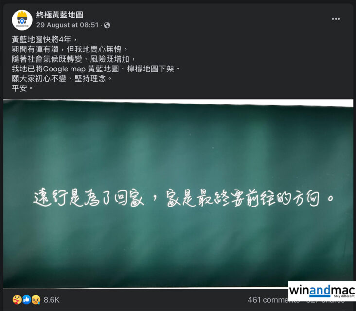 抗爭期間,不少人消費前都會先查閱商戶背景,黃藍地圖就是很好的指南。終極黃藍地圖團隊近日宣佈,隨著社會氣候既轉變、「風險既增加」,他們已把Google地圖中的黃藍地圖、以及檸檬地圖下架。現在要瀏覽http://lemonmap.io,已經無法使用。終極黃藍地圖表示,「願大家初心不變、堅持理念。」。