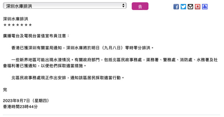 香港在這幾個小時發生大暴雨,多區水浸,並發出黑色暴雨警告,鄰近深圳亦同樣受暴雨影響。深圳在今日8號零晨突然排洪,唯港府當局僅於排洪前16分鐘發出通知,並提到一些新界地區可能出現水浸情況。通知稱相關政府部門,包括北區民政事務處,渠務署、警務處、消防處、水務署及社會福利署已獲通知,以便他們採取適當措施。北區民政事務處現正作出安排,通知該區居民採取適當行動。